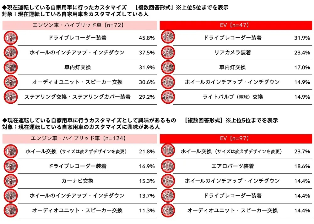 続いてエンジン車・ハイブリッド車では2位「ホイールのインチアップ・インチダウン」(37.5%)、3位「車内灯交換」(31.9%)、EVでは2位「リアカメラ装着」(23.4%)、3位「車内灯交換」(17.0%)という結果に。