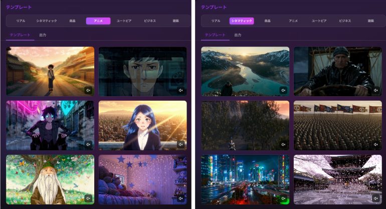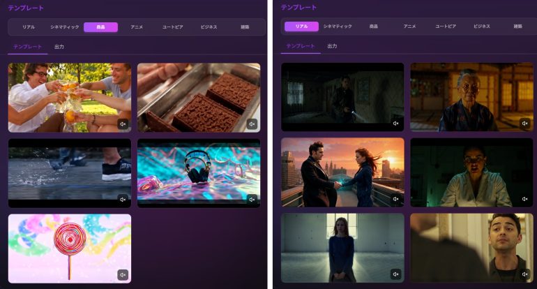 このほか、プロンプトの書き方に悩んでいる人や、さまざまなスタイルの動画を試してみたい人に向けて、映像スタイル別のテンプレートも用意。気になるテンプレートを選択すると、サンプル映像とプロンプトをすぐに確認でき、そのままワンクリックで生成することも、プロンプトを少し手直ししてから生成することも可能だ。