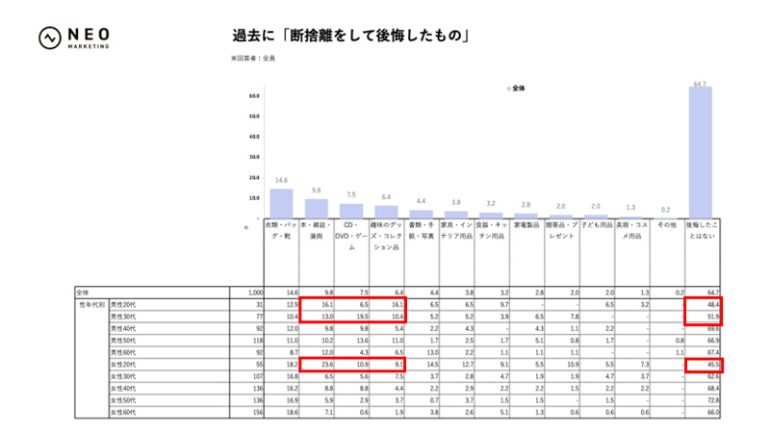 前掲設問(※)では、断捨離前に約60%が情報収集をおこない、断捨離をしようとしてやめた経験も43.1%に上っていた。こうした“事前に調べる”“途中で立ち止まる”慎重さが、結果として後悔の少なさにつながっていると考えられる。