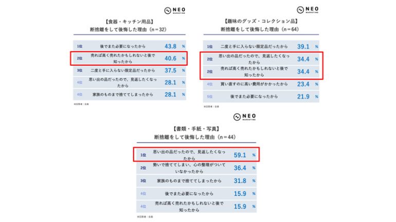 一方、本・雑誌・漫画やCD・DVD・ゲーム、趣味のグッズ・コレクション品、書類・手紙・写真では、「思い出の品だったので、見返したくなったから」が上位に。情報や記録、思い出が残るものほど後悔につながりやすい傾向だ。