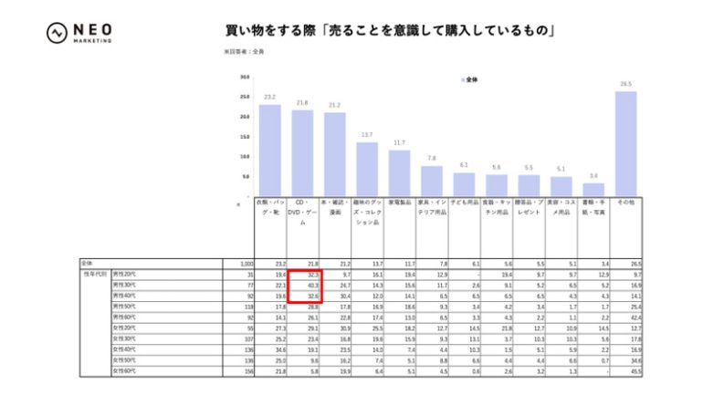 性年代別では、男性30代の「CD・DVD・ゲーム」(40.3%)、男性40代32.6%、男性20代32.3%が目立ち、若年~中堅男性では娯楽系を“いずれ売るもの”として捉える感覚が比較的強いようだ。