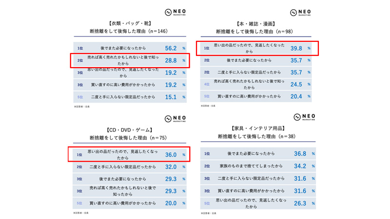 一方、本・雑誌・漫画やCD・DVD・ゲーム、趣味のグッズ・コレクション品、書類・手紙・写真では、「思い出の品だったので、見返したくなったから」が上位に。情報や記録、思い出が残るものほど後悔につながりやすい傾向だ。