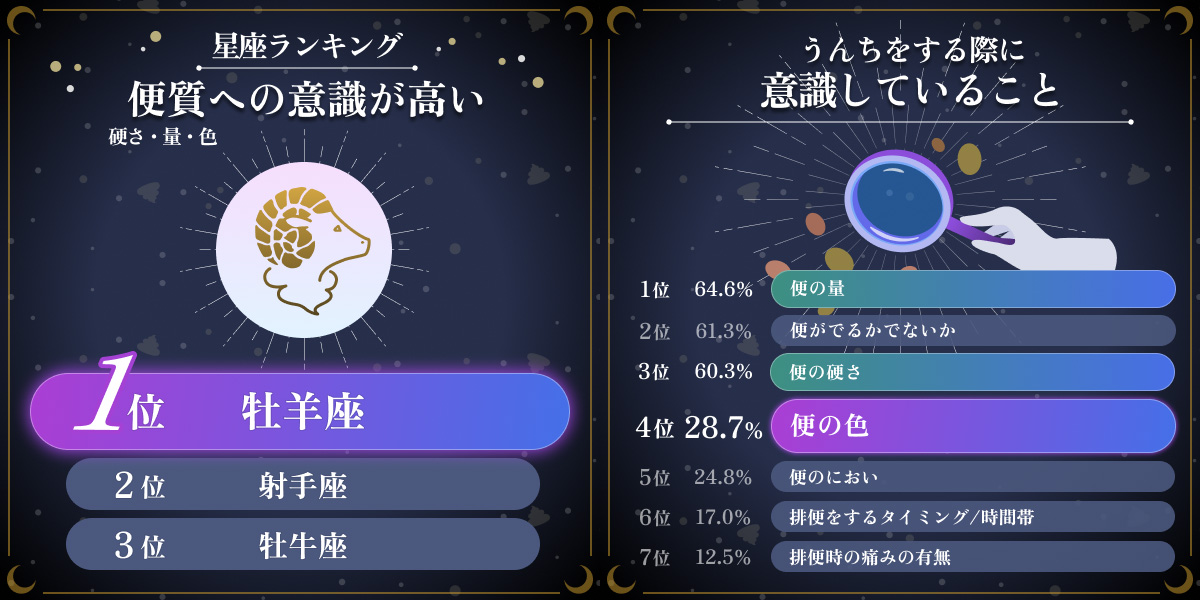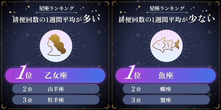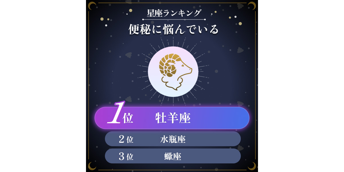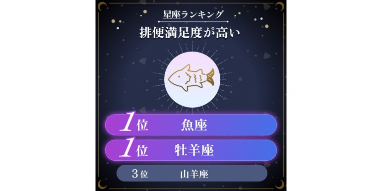 排便時のスッキリ感を評価する「排便満足度」を聞いたところ、最も高い星座は「魚座」と「牡羊座」が同率の1位で、次いで3位は山羊座であることがわかった。