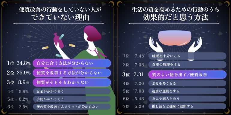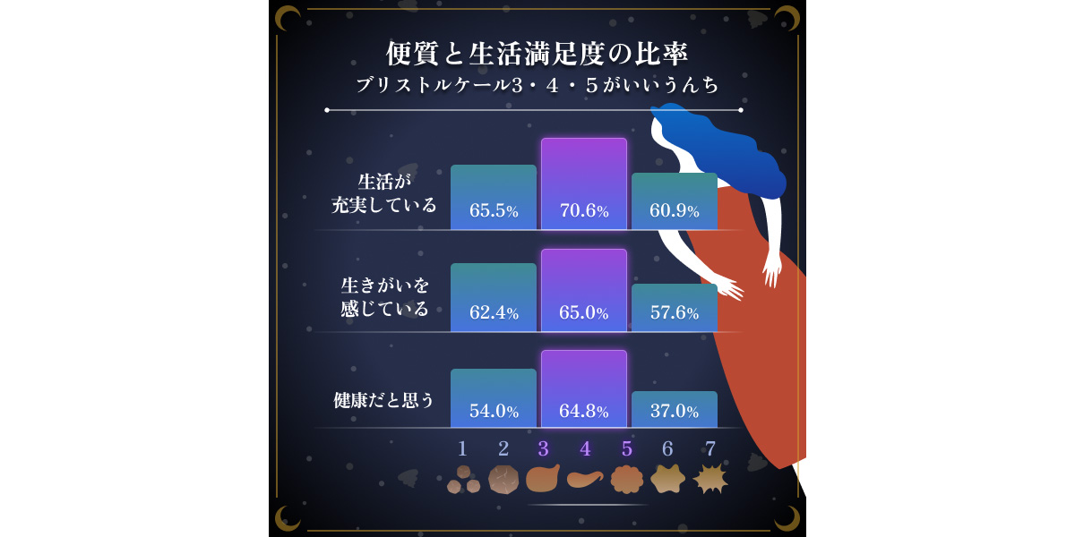 ブリストルスケール(便の硬さとかたちを7段階に分類する世界基準)を基準に、便質が良い人と悪い人で生活の充実度などを聞いた結果、便の質が良いと回答した人ほど、「生活が充実している」「生きがいがある」「健康である」「仕事へのモチベーションが高い」と回答した。この結果により、便質とQOLには深い相関性があることが改めて明らかになった。