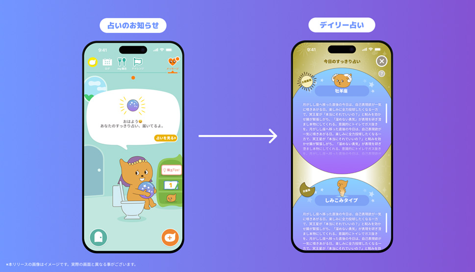 「占い」と「便質」に関しては、天藤製薬が2023年より推進している「便質改善プロジェクト」の第三弾として、腸活アプリ「ウンログ」内に「すっきり占い」を新たに実装。