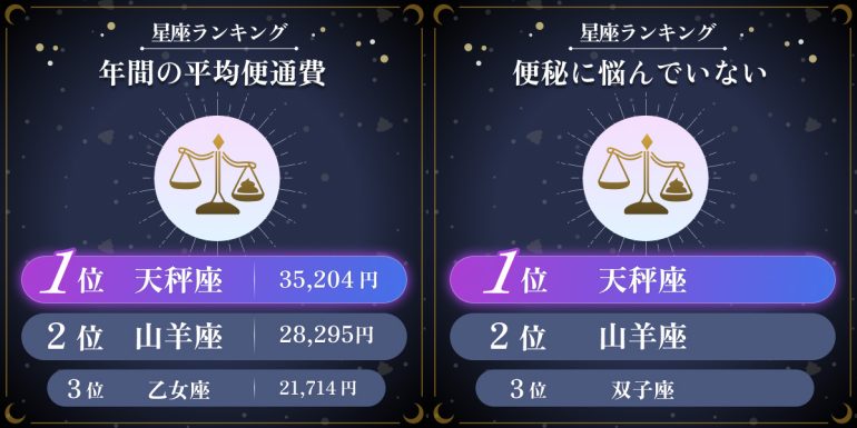 星座別では天秤座が平均35,204円と最も多く、同星座は「便秘の悩みが少ない星座」1位でもあった。また便通費2位の星座である山羊座も同じく、「便秘の悩みが少ない星座」2位となっており、便秘対策費の多さと悩みの少なさに相関がある可能性が示唆された。