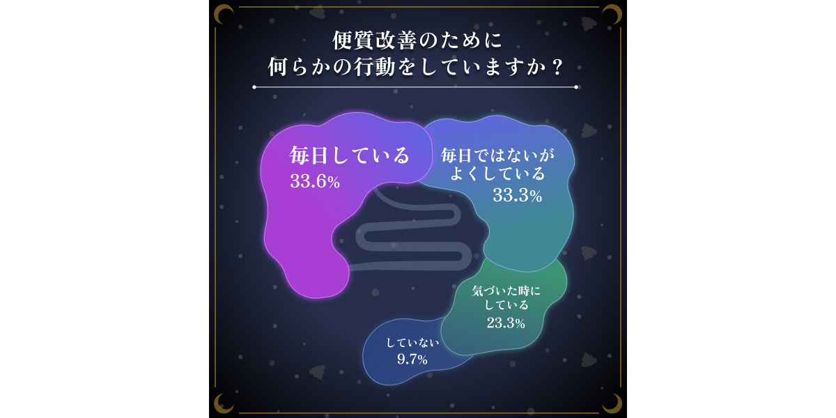 QOLを高めるための効果的な行動として「便質改善」が上位に挙がったが、実際に毎日行動できている層は33.6%にとどまった。