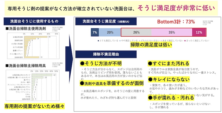 洗面ボウルの掃除は従来、思い思いの道具を使いどの家庭でも行なっていた。だが、どんな道具や洗剤を使ったらいいのか、正解がわかりにくくモヤモヤしやすい側面がある。洗面ボウル専用洗剤を提案することで、キレイにできるだけではなく、そんなモヤモヤを解消し前向きに洗面ボウルの掃除に取り組めるマインドに変える効果があった。