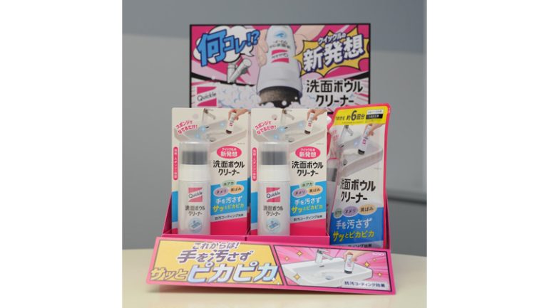 『クイックル 洗面ボウルクリーナー』は、スポンジと洗剤の容器を一体化。掃除道具を準備する必要がなくなり、手を汚すことなく、なでるだけで洗面ボウルの掃除ができるようにした。洗面台に置きっ放しにしても邪魔にならないコンパクトサイズで、歯磨きしながらなど、何かしながらでも掃除できる。