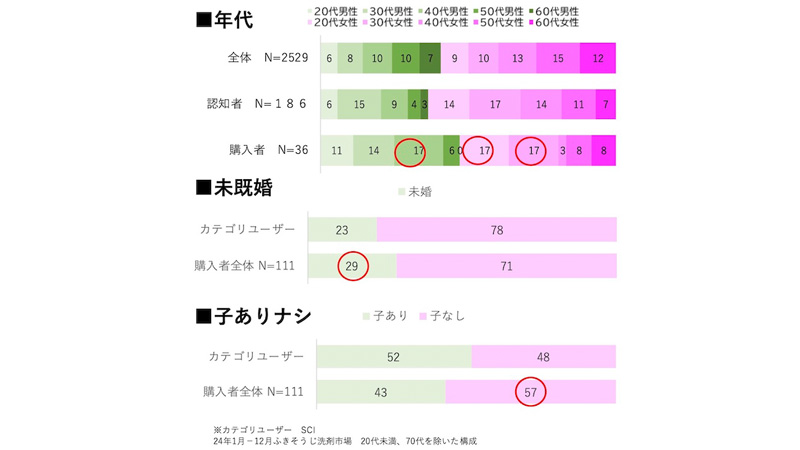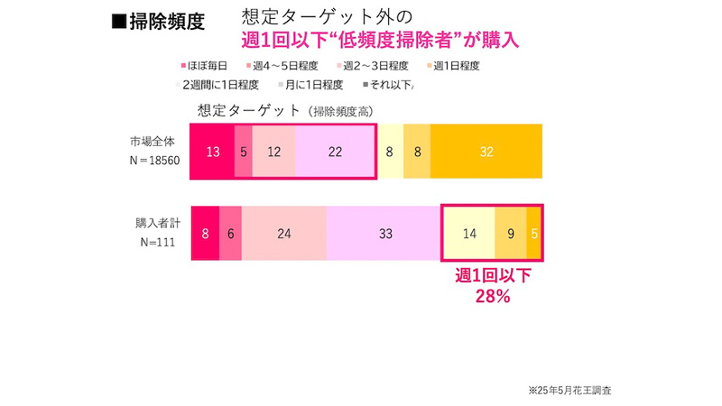 また、掃除の頻度が低い人の購入も多い。掃除用品は掃除の頻度が高い人ほど購入するものだが、購入者を調べたところ、掃除する頻度が週1回未満の人も多く購入している。中には、購入をきっかけにして掃除する頻度が月1回ほどだったのが月5回に上がった人もいた。