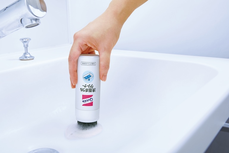 『クイックル 洗面ボウルクリーナー』は、スポンジと洗剤の容器を一体化。掃除道具を準備する必要がなくなり、手を汚すことなく、なでるだけで洗面ボウルの掃除ができるようにした。洗面台に置きっ放しにしても邪魔にならないコンパクトサイズで、歯磨きしながらなど、何かしながらでも掃除できる。