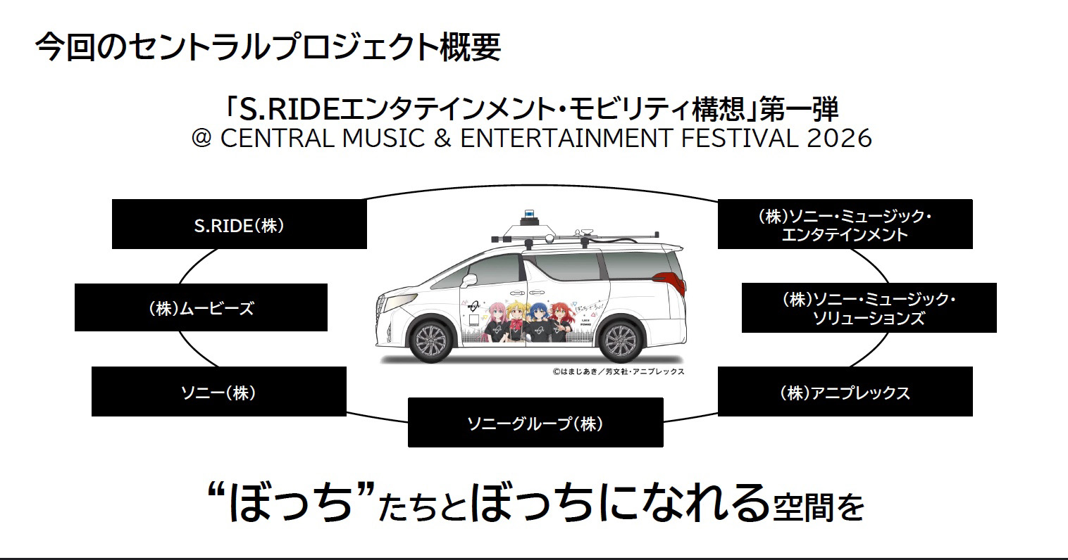 S.RIDE株式会社の株の半分をタクシー会社が所有しているが、ソニーグループ株式会社も主要株主となっている。そこで今回公開した“S.RIDE エンタテインメント・モビリティ構想 ”は、移動体験事業で培ってきたS.RIDE株式会社とソニーグループ全体の技術やIPアセットを最大活用し、ロボットタクシー時代を見据えたモビリティエンタメサービスの進化を加速させ、ライブに行く際に、ロボットタクシーを利用し、その時点から没入感に浸ってもらおうと考えているのだ。