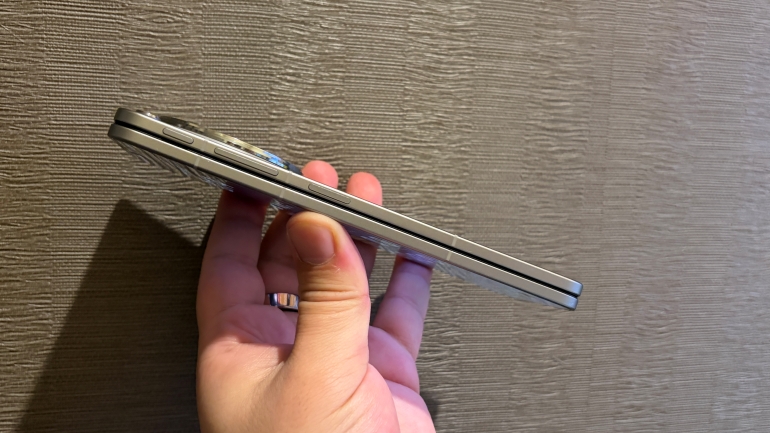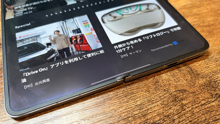 折りたたみスマホにおける懸念点の1つに、折り目のへこみが気になるというものがあるだろうが、OPPO Find N6のそれは非常に見えにくく進化しており、ぱっと見ではわからないほどの仕上がりになっている。実際に触ると、わずかに凹凸を感じるものの、使っていて違和感を覚えるシーンはほぼない。