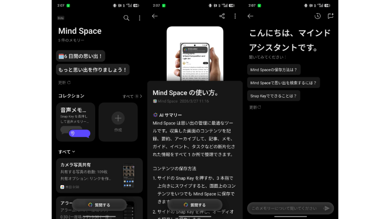 撮影されたスクリーンショットは、AIマインドスペースアプリに蓄積されていき、画像内の情報を解析して、サマリーを表示してくれる。Snap Keyを長押しすれば、ボイスメモとして音声を残すことも可能だ。