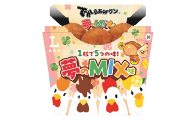 特徴:衣はレギュラーの味付け、中の鶏肉部分はレッド・チーズ・レモンそれぞれの味わい、さらにマヨキューブを入れた。1度に5つの味わいを楽しめる。通常のからあげクンに比べて、1粒あたりのサイズを約4割大きくした“でからあげクン”シリーズでラインアップ。