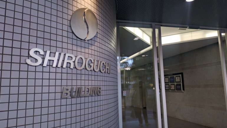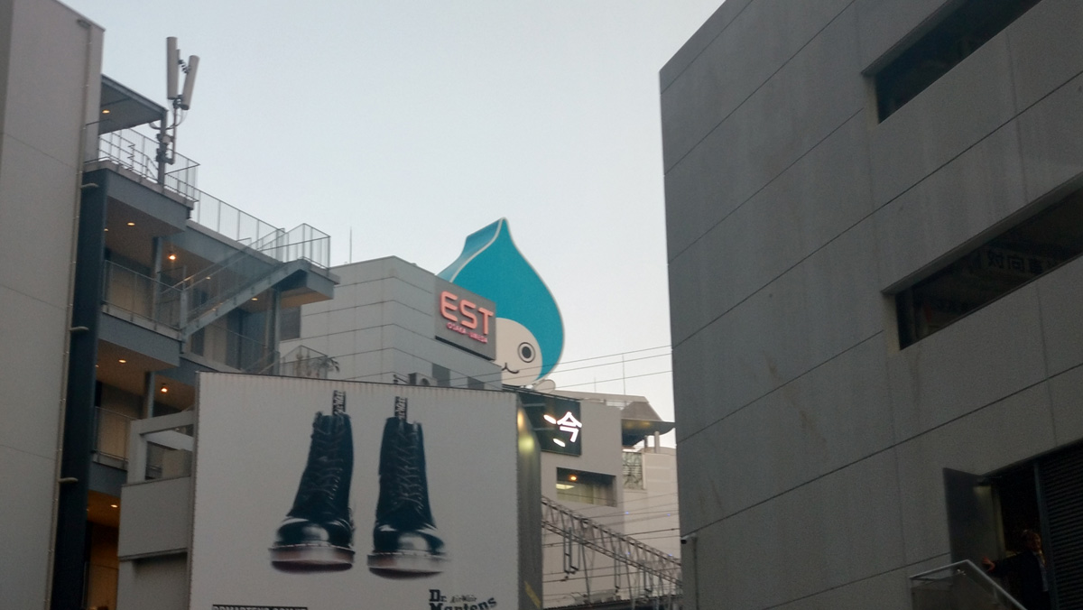 大ぴちょんくんが鎮座するのは、3月に下水道工事のための鋼鉄製のパイプが13mの高さまで出現してニュースとなった道路の真ん前にあるシログチビルの屋上だ。8階建てのビルの屋上から、さらに階段を登る。