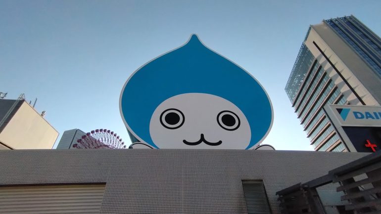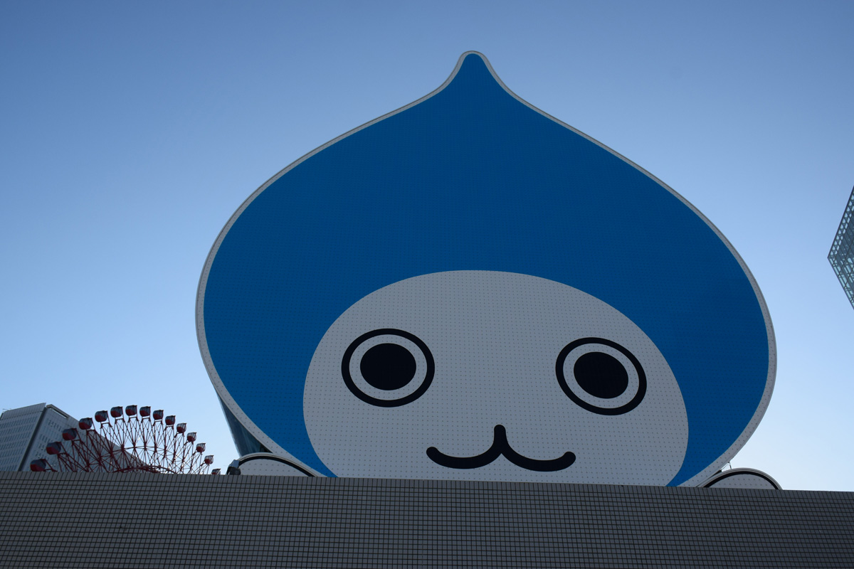大阪の名物看板といえば、『道頓堀グリコサイン』やカニ料理専門店『かに道楽』の動く『かに看板』、中座くいだおれビルの『くいだおれ太郎』などがある。個性が光る看板が並ぶ中、道頓堀エリアではなく梅田にも名物巨大看板があるのをご存じだろうか。それが、梅田・シログチビル屋上に鎮座する、ダイキン工業株式会社の”うるるとさらら”のキャラクター『ぴちょんくん』を模した巨大看板『大ぴちょんくん』だ。