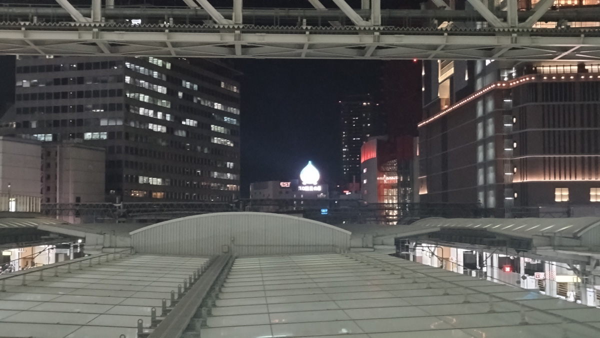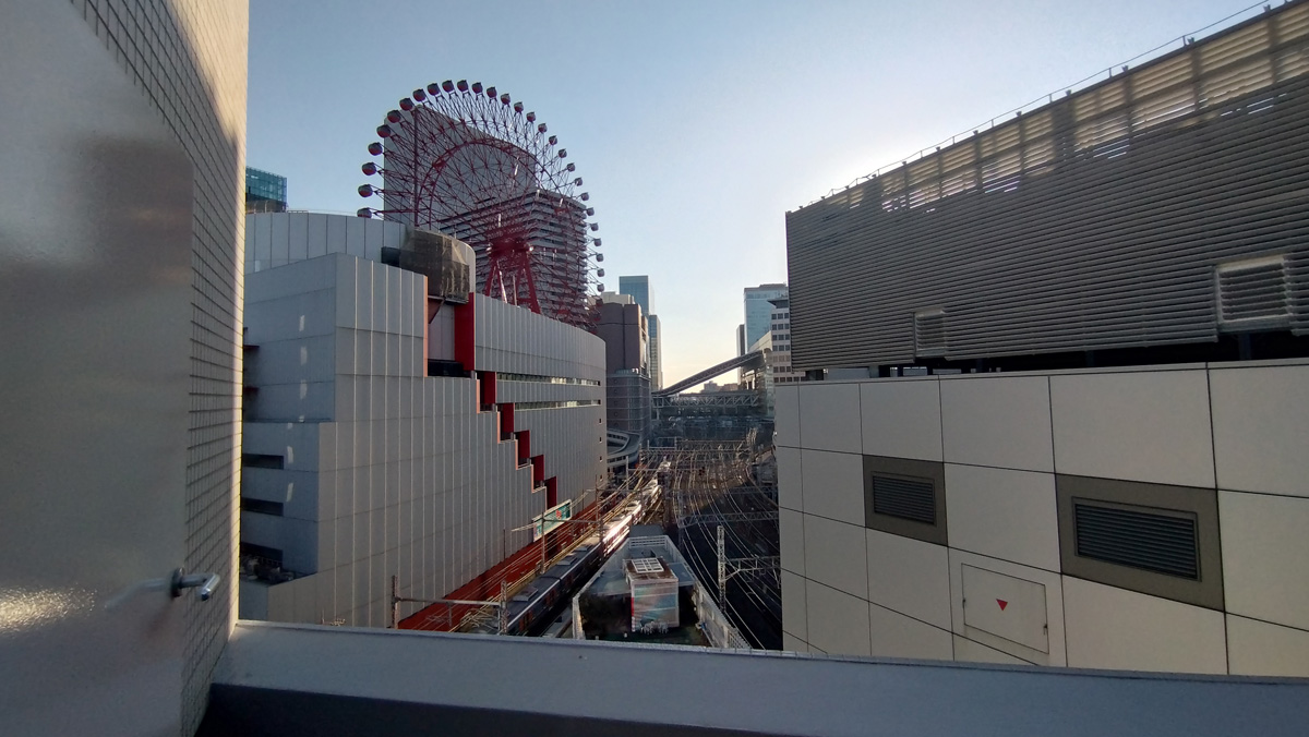 屋上からはJR大阪駅に続く線路や、梅田のランドマークであるHEP FIVEの赤い観覧車も見える。