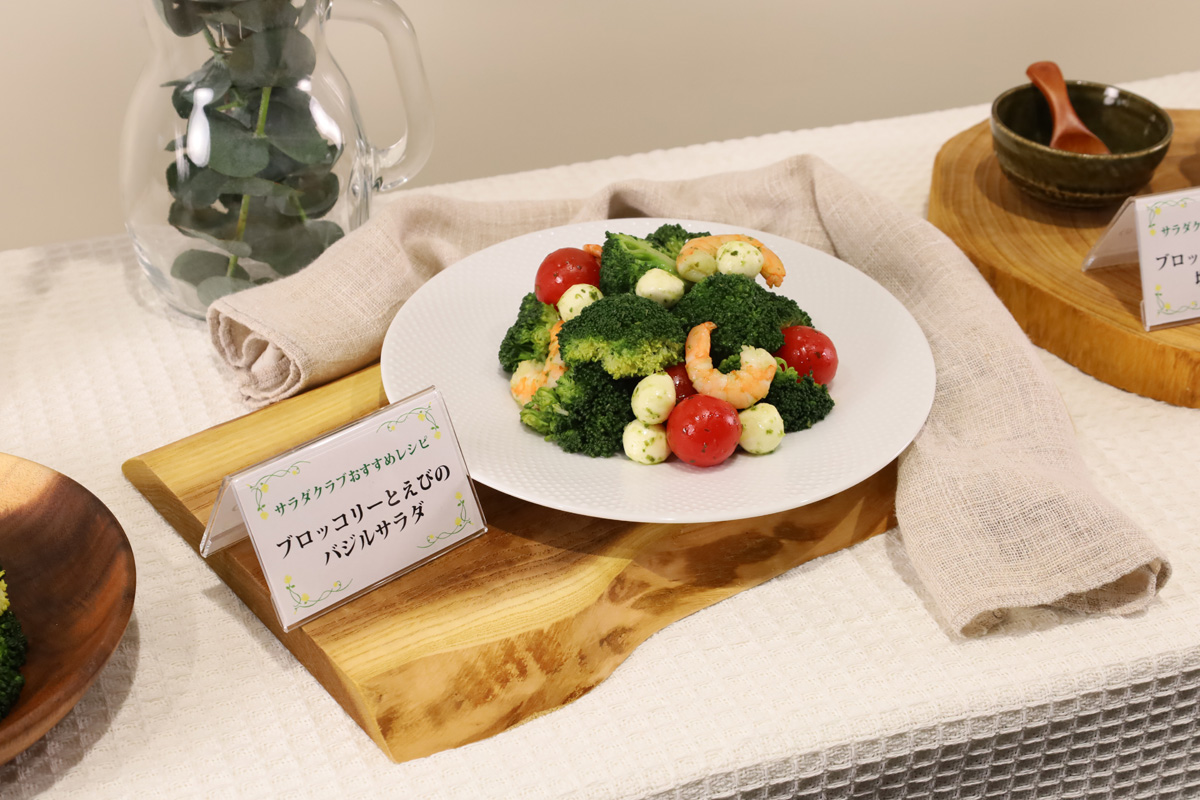 蒸しブロッコリー、茹でエビ、ミニトマト、チーズをバジルソースで和えるだけ。平塚氏は、「生のブロッコリーから作れば15分かかる工程が、パクベジならわずか2分。エビのプリッとした食感とブロッコリーのコリコリ感が絶妙にマッチし、あっという間にデパ地下風のデリが完成します」と、その手軽さをアピールした。