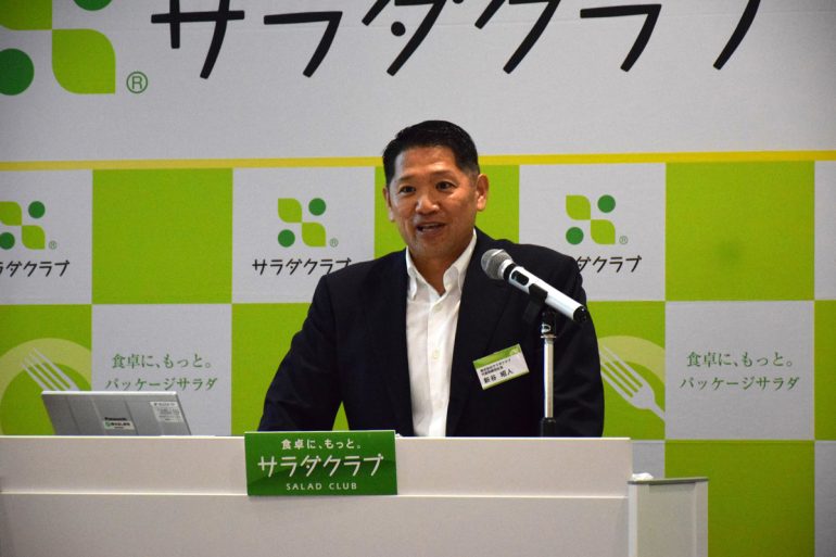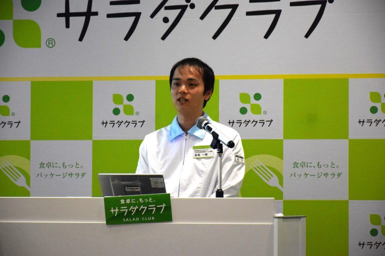 サラダクラブの新谷昭人社長は、同社の思いとして「日本の農家さんを応援する。消費者に野菜を食べて健康になってもらう。地球環境に優しい会社を目指す」という3つのコンセプトを紹介。その思いを形にするために『パクベジ』を開発したという。