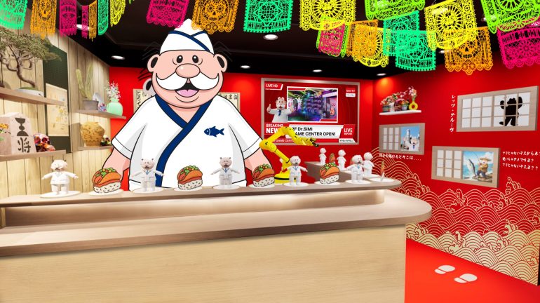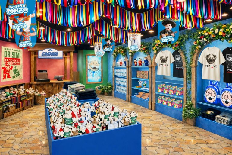 1階には板前に扮したドクター・シミが出迎えてくれ、店内には参加型のゲームや限定品が手に入るショップがあり、彼の人気と魅力がわかる仕掛けになっている。