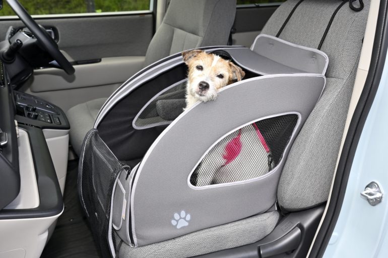 ちなみに愛犬の助手席への乗車は道路交通法違反に問われる可能性があるとともに、万一の際、エアバッグの展開によって愛犬が傷つくこともあるので厳禁である。もっとも、飼い主1人(ドライバー)と愛犬(超小型犬)の2人でのドライブで、どうしても寂しがり屋の愛犬を助手席に乗せたい・・・というなら、ホンダ純正のドッグアクセサリー、Honda Dogシリーズのペットシートプラスわん2の使用を薦める。理由はエアバッグの展開から守る自動車メーカー純正品ならではの形状、工夫がなされているからだ(上部のカバーは閉めておくこと)。