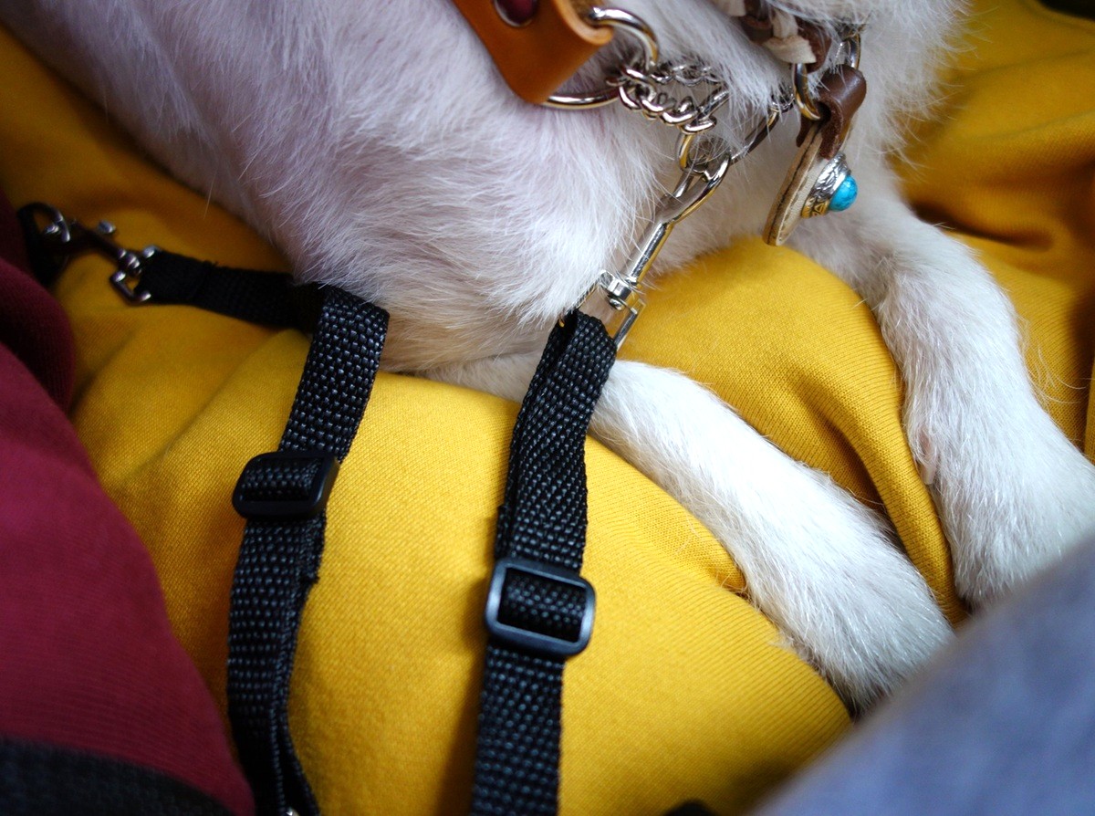 お散歩(車外)でソフトハーネスとリードをすでに装着していれば、そのまま後席に乗せ、固定できるという簡単さ、メリットもある。ただ、ドッグベッド/サークルやペットカートのキャビンに乗せるのに対して、車内の抜け毛の飛散、臭いの付着、シート周りの汚れ防止という点では及ばないことになる。※ドッグウエアとの併用が難しいため。