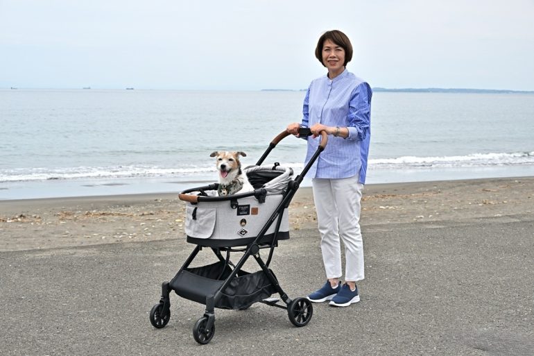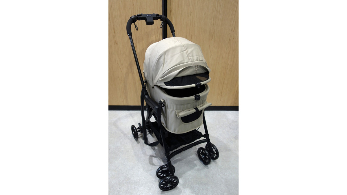 今年のインターペット東京では、コムペットの新作、カーリングISOFIXとの組み合わせで後席にしっかりと固定できるペットカートMilimili Caryが披露されていた。