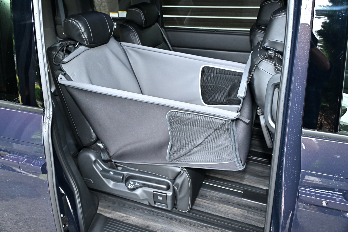 大型犬を後席に乗車させる際は、ボックス型、またはハンモック状のペットシートを装着するといい。ただし、前部にメッシュ窓があることが重要だ。前席の飼い主と愛犬がアイコンタクトでき、愛犬の様子を管理しやすくなると同時に、エアコンの風が届きやすくなるからである。※後席エアコン吹き出し口があるクルマならなおさら。
