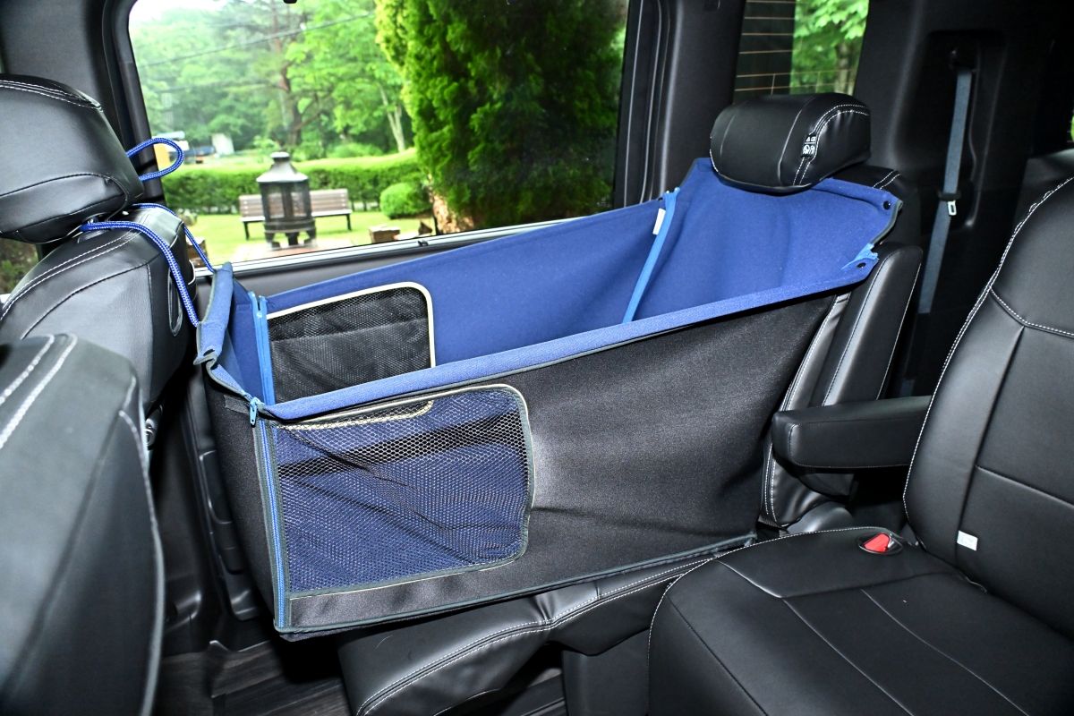 後席で愛犬が安心・安全・快適に過ごすことができるのが、箱型のドッグベッド/サークルで、主に前後のヘッドレストにロープなどで固定するタイプだ。