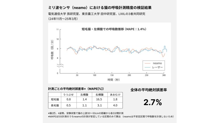 LIXIL、電気通信大学の孫光鎬准教授および東京農工大学の田中綾教授は、ミリ波センサーを用いた猫の呼吸計測精度に関する共同研究を実施した。