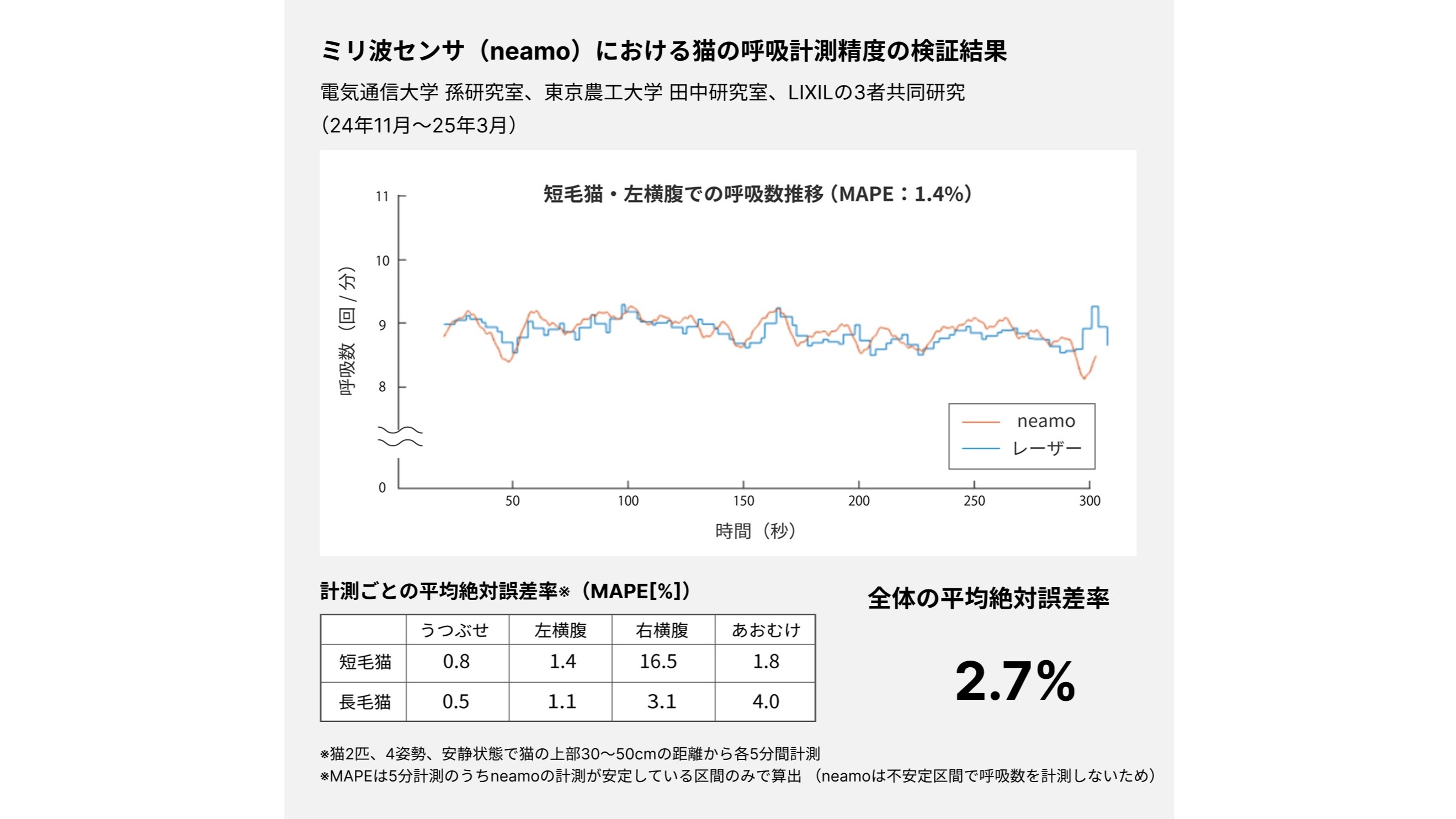 猫にミリ波を照射し、体表面で反射された反射波を計測することで、猫に触れることなくお腹の上下運動から呼吸数を算出することができる。長毛猫と短毛猫を測定対象とし、自動車部品や電子機器・デバイスの微細な歪み測定、医療用機器のキャリブレーション(校正)など、極めて高い精度が要求される産業分野で利用されている高精度レーザー計測器をリファレンスとして、非接触型呼吸計測デバイス「neamo」に用いるミリ波センサーの測定精度を検証した。