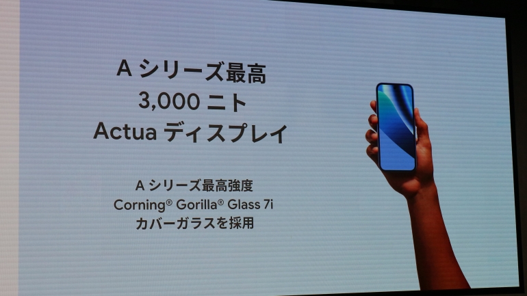 Aシリーズ史上最も優れた耐久性を誇り、ディスプレイには傷や落下に強い「Corning Gorilla Glass 7i」を採用。IP68準拠の防水・防塵性能も備える。さらに、フレームに100%リサイクルアルミニウムを使用し、梱包材は完全プラスチックフリーを実現するなど、環境への配慮も行われている。