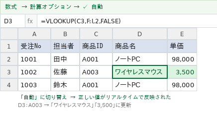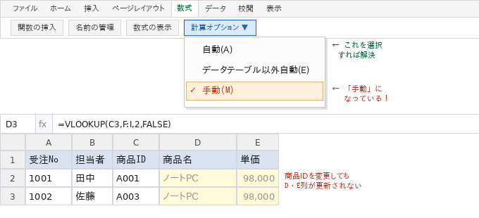 VLOOKUPが反映されない原因①:自動計算がオフになっている