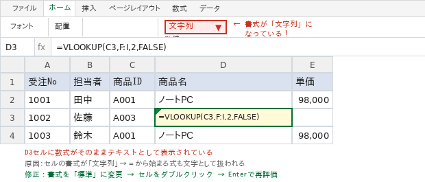 VLOOKUPが反映されない原因②:数式がテキストとして入力されている