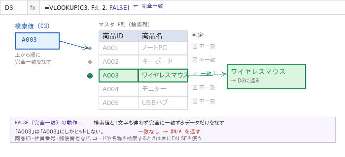 | FALSE(または0) | 完全一致:検索値と完全に同じ値だけを探す | 商品ID・社員番号など、完全に一致するものを探すとき |