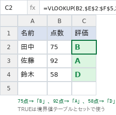 → 75点 → 70以下で最も近い「70」の行 → 評価「B」が返る
