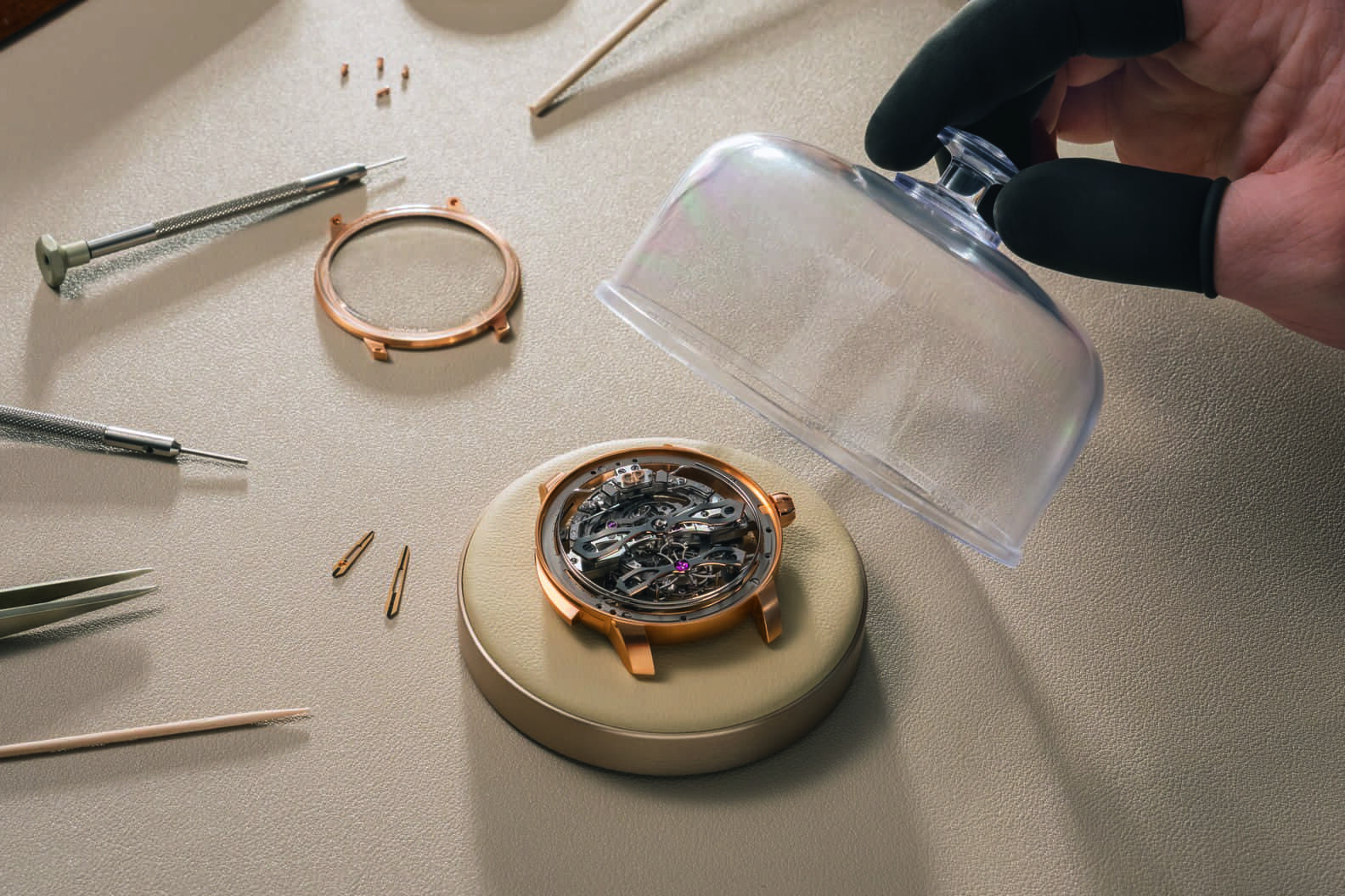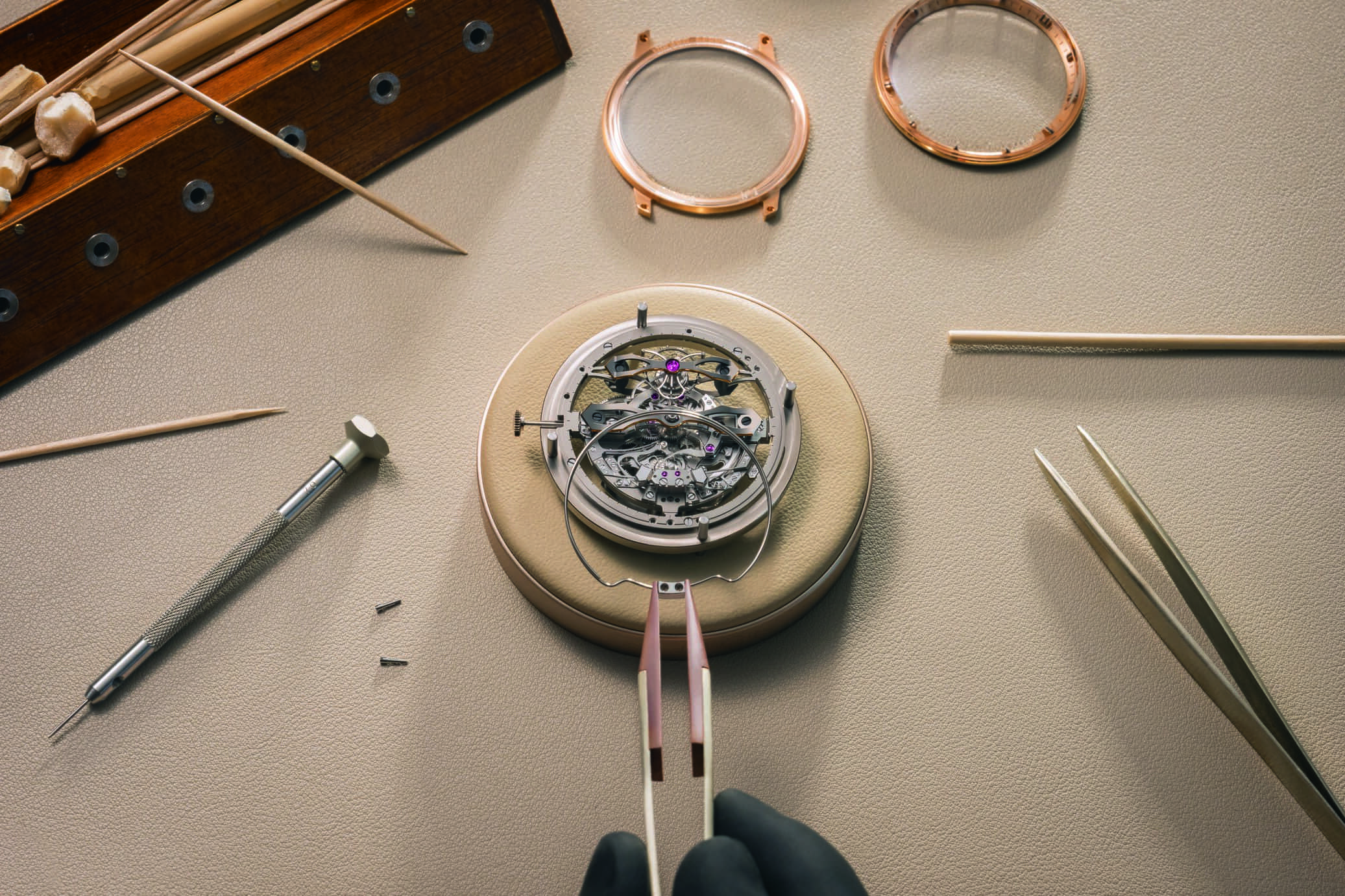 この傑出したタイムピースを製作した時計職人に敬意を表して、その職人の名のイニシャルを刻んだ小さなプレートが、完成した作品の上品なシグネチャーとしてスケルトン加工されたキャリバーにさりげなく組み込まれている。