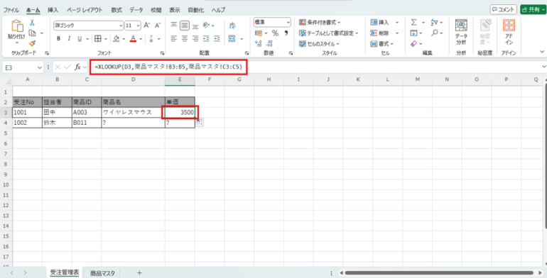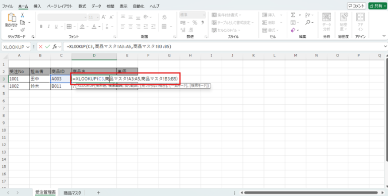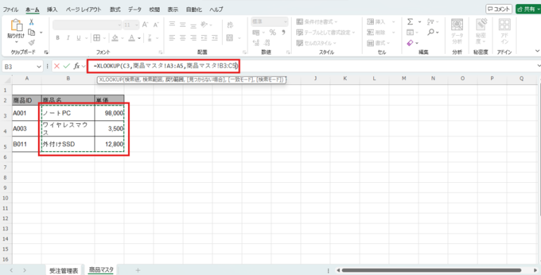 =XLOOKUP(C3,商品マスタ!A3:A5,商品マスタ!B3:C5)