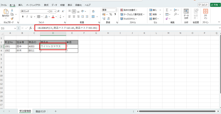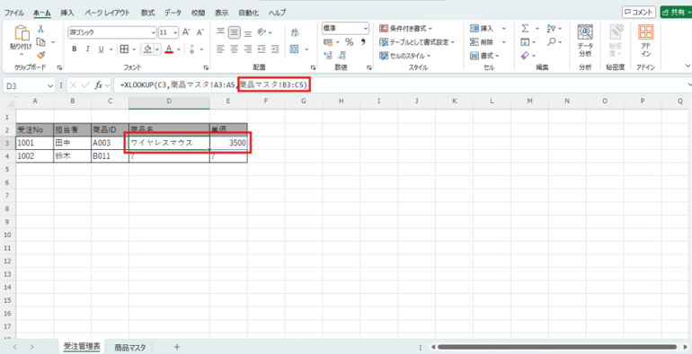 =XLOOKUP(D3,商品マスタ!B3:B5,商品マスタ!C3:C5)