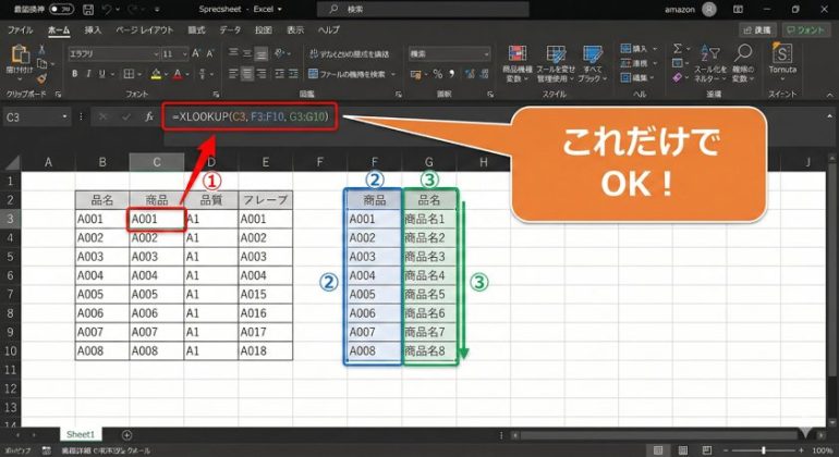 XLOOKUPの使い方で最初に覚えることはシンプルです。