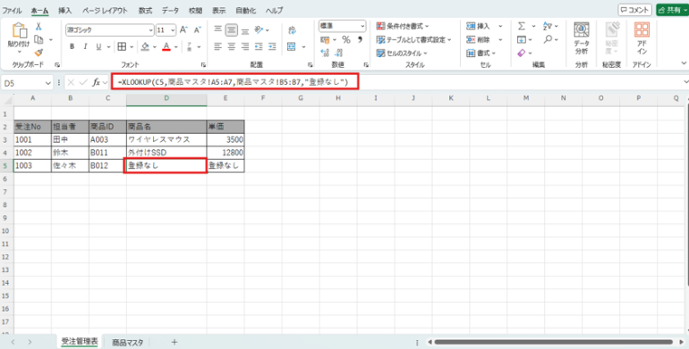 =XLOOKUP(C5,商品マスタ!A5:A7,商品マスタ!B5:B7,"登録なし")