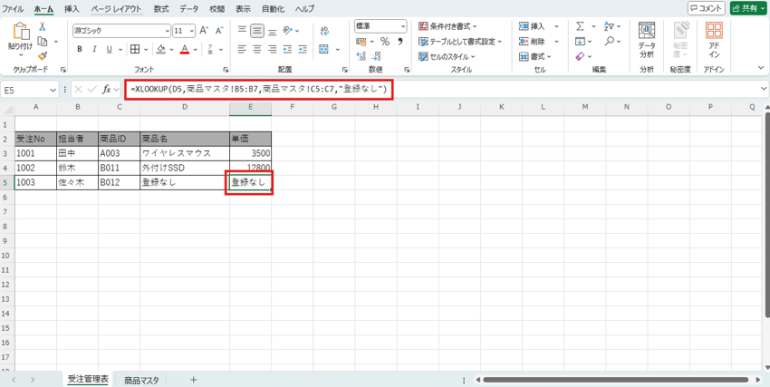 - XLOOKUP:=XLOOKUP(C5,商品マスタ!A5:A7,商品マスタ!B5:B7,”登録なし”)→ 1つの関数で完結