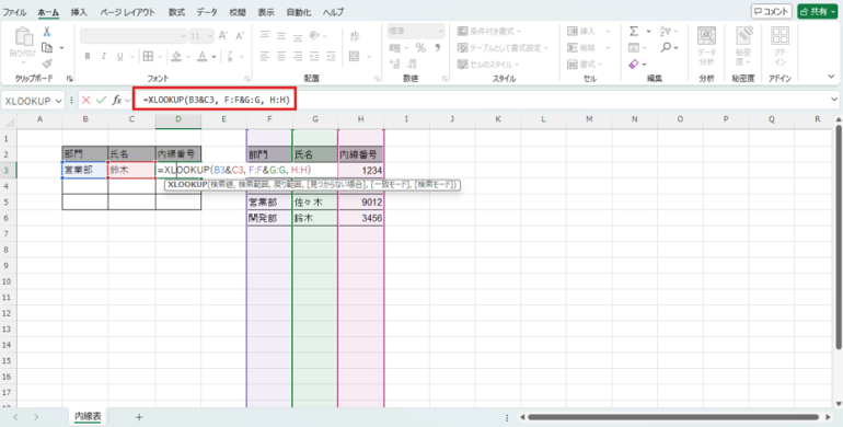 こちらは同姓同名の社員がいて「営業部の鈴木さん」だけを特定したいケースで有効です。&(アンパサンド)で検索値と検索範囲をそれぞれつなぐだけで、2つの条件を組み合わせた検索ができます。