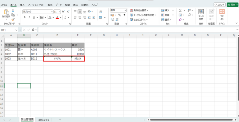 マスタに存在しない商品IDを入力したとき、VLOOKUPでは「#N/A」というエラーが表示されます。これを消すために =IFERROR(VLOOKUP(…), “登録なし”) という長い式で囲む必要がありました。