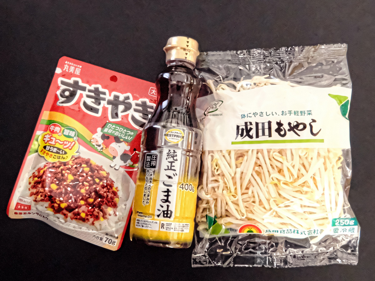 ↑器の底の方にはもやしから出た水分が溜まってるので、それを捨てる。もやしが流れ出ないように箸かなんかで押さえながら、流しの上で器を斜めにして水というかお湯になった水分を捨てればいい。で、そこにごま油を少々垂らして混ぜる。少々といっても「どのくらいだ?」とお思いでしょうが、混ぜた時にもやし全体に油が薄ぅ~く纏う程度。写真のもやしの量だとティースプーン一杯くらい。この時、好みでごま油以外にラー油を入れても美味い。ただ全部ラー油にすると、ラー油の風味が勝ちすぎて、後で混ぜる『すきやき』の風味が弱まるので、ごま油よりは少なめの割合をオススメ。