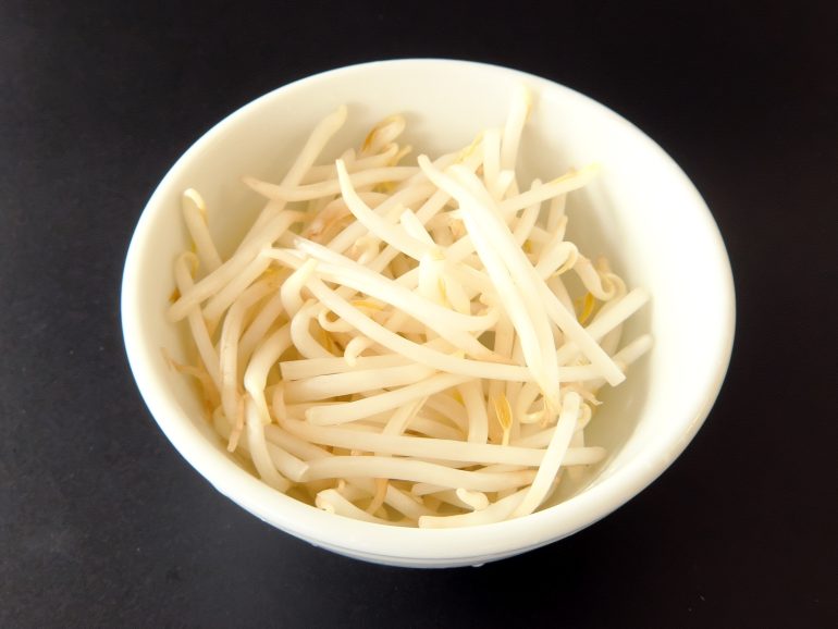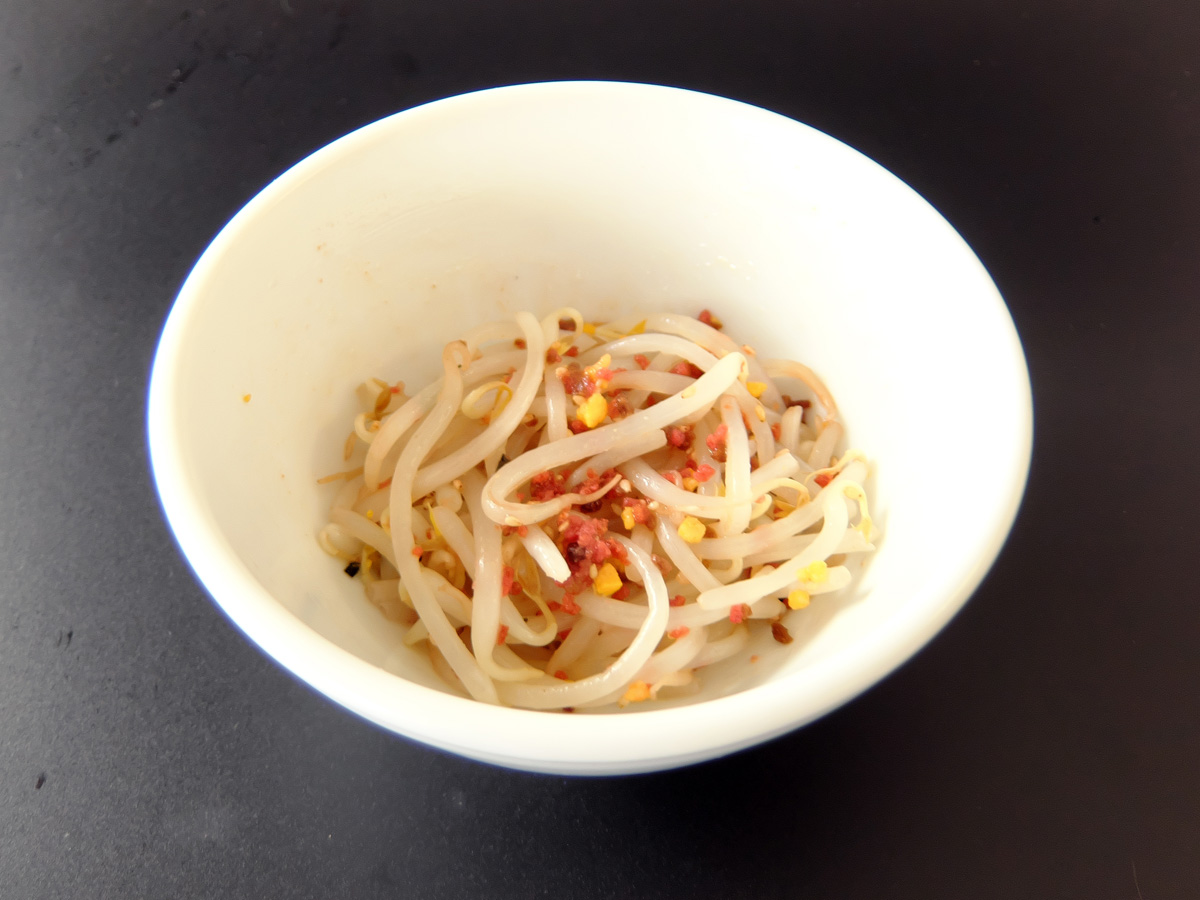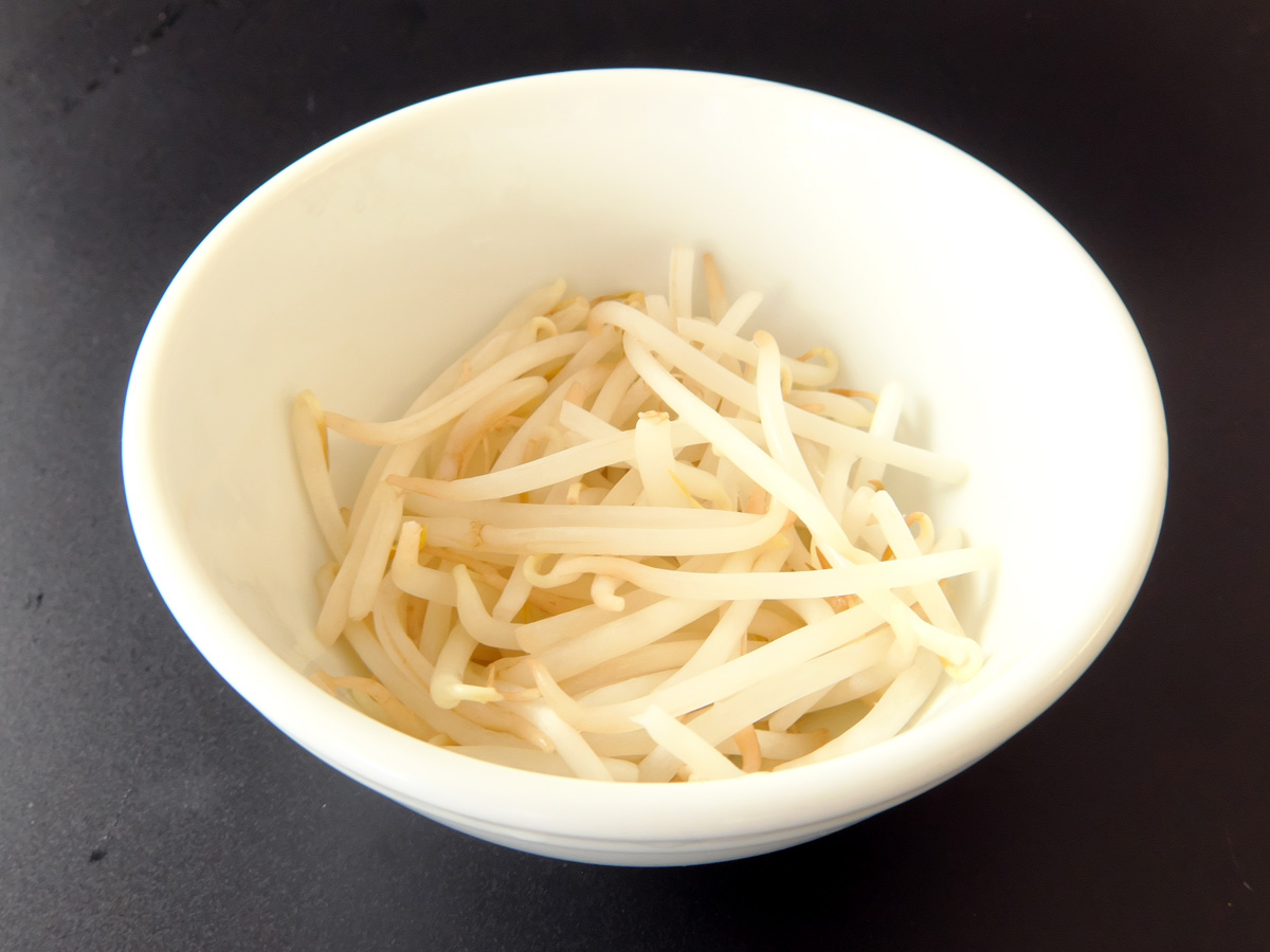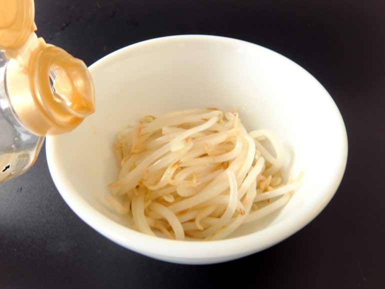 ↑洗ったもやしを電子レンジ600Wで1分ほど加熱する。ラップはしなくていい。加熱する時間はもやしの量にもよるけれど、とりあえず1分やってみて、上の方のもやしを一本かじってみる(火傷には気をつけるように)。で、好みの熱の通り方になってたらそれでOK。まだ生っぽいと思ったら、器の下の方にもやしの方が熱は通りやすいので、器の中でもやしの上と下をひっくり返して20秒くらい加熱すれば、まぁ大丈夫でしょう。