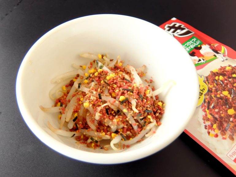 どうです、メインの食材が『もやし』と『ふりかけ』という、超経済的なヤツだとは思えない、なんか高級前菜みたいな見た目でしょ?