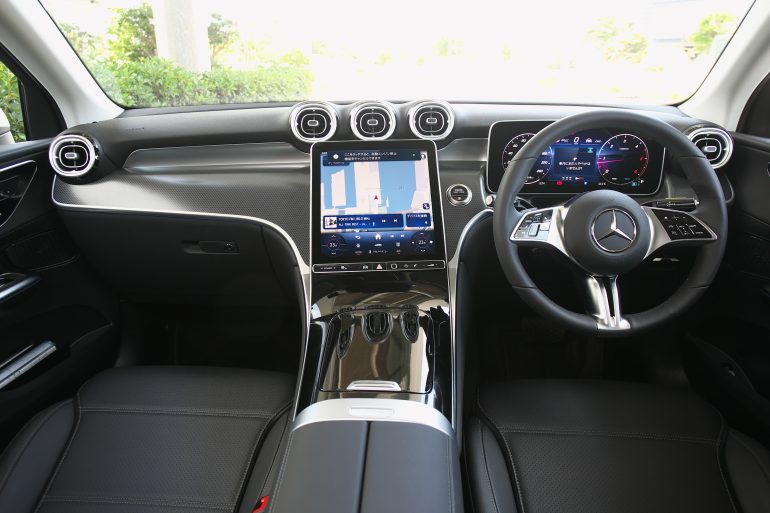 その「GLC」に2025年3月、新しいモデルが加わった。「core(コア)」と名付けられたそのモデルは、標準装備を見直し、シンプルな構成にしたモデル。外観はノーマルモデルと変わらず、ボディカラーが定番の白と黒とシルバーの3色に限定、スポーティな外観となるAMGパッケージも選べる。内装はレザーARTICOで、色はブラックが基本だ。オプションはAMGラインパッケージとパノラミックスライディングルーフの2つだけ。今回、試乗したのは「GLC 220d 4MATIC CORE ISG」。