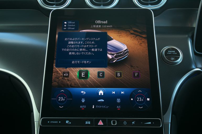 「GLC」のセレクトモードはエコ/コンフォート/スポーツ/iのほかに、オフロードモードが備わる。このモードでは360°カメラを使い、メディアディスプレイ画面に、クルマのフロント部分下方の路面の映像を仮想的に映し出すトランスペアレントボンネット機能が使用できる。進路上にある大きな石や深い窪みなどの障害をいち早く発見することができるモードでもある。